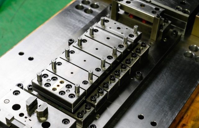 c.级进模(也称连续模) 在毛坯的送进方向上,具有两个或更多的工位,在压力机的一次行程中,在不同的工位上逐次完成两道或两道以上冲压工序的模具。